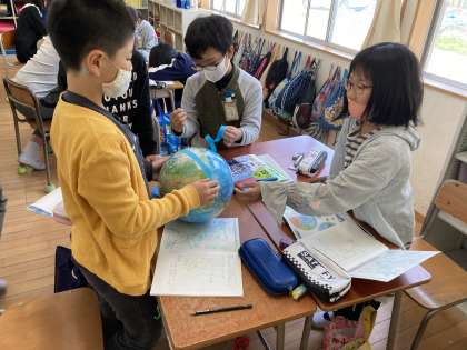 また、社会科では地球儀を使って学習をしました。紙テープを使って、日本からブラジルまでの距離を調べたりなど、楽しく学習をしました。これからどんどん世界や日本のことについて学んでいきます。楽しみですね。
