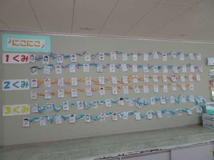 今日の写真は、1年生廊下に掲示されている似顔絵です。自分の顔を「にこにこ」笑顔いっぱいに描きました。