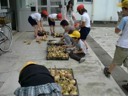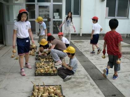 今日は、収穫したたまねぎを大きさ別に分ける活動をしました。大きいものと小さいものに分けましたが、「中くらいのは、どうするの?」「これは、どっちに入るのかな?」と考えながら活動していきました。みんなで協力したので、あっという間に分けることができました。