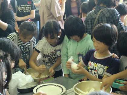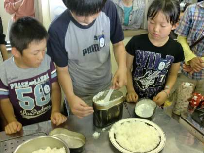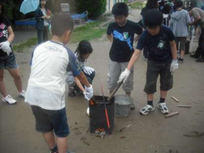 小雨の中、飯ごう炊飯がやれるかどうか心配しましたが、何とか空も明るくなってきたので、外で実行しました。まきとスギを入れて火を起こし、火の強さと時間、飯ごうの様子を観察しながら炊きはじめました。お家の方々も手伝ってくださり、調理室で飯ごうのふたをあけた時は、それはそれはおいしそうな、つやつやのご飯が出来上がっていました。おにぎりを作っておいしそうにほおばっている様子を見て、飯ごう炊飯ができてよかったと思いました。