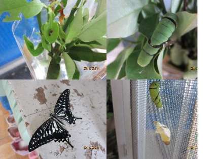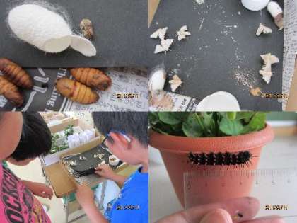 2日間の間にまたまた虫たちが大変身していました。アゲハチョウが、サナギから羽化してすばらしく美しい成虫になっていました。また、蚕は、繭からどんどん蚕蛾になって交尾して、メスが産卵をしています。繭からサナギを出してみたら、茶色の皮に覆われたサナギが現れ、ピコピコ動いて脱皮の準備をしていました。そして、本日、新顔君がやって来ました。黒とダイダイのストライブに黒いとげとげ。初めて見た人は、ちょっとこわいかな?これは、実は「ツマグロヒョウモン」というチョウの仲間です。パンジーやビオラ、スミレなどの葉っぱを好んで食べます。これからどんな変身をするのかが楽しみです。しかし、このツマグロヒョウモンは、ヒートアイランドによって北の方にも生息するようになったチョウです。こうした生き物の生息の変化を調べることは、生き物の生態系を考えるために大切なことですね。