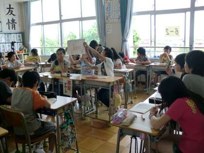 国語の授業では、第1回目の学級討論会を行いました。今日の話題は、「動物園にいる動物は幸せか」です。それぞれ肯定・否定のグループに分かれ、聞くグループを納得させられる主張を考えて臨みました。予想外の質問が出て戸惑う場面もありましたが、全員が自分の主張をしっかりと話すことができました。