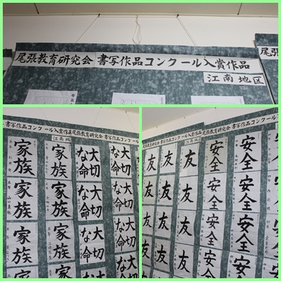 書写作品コンクール江南地区の入賞作品が掲示されています。市内の児童の作品が鑑賞できます。南舎1階の廊下に掲示しています。本日お越しの際にご覧ください。
