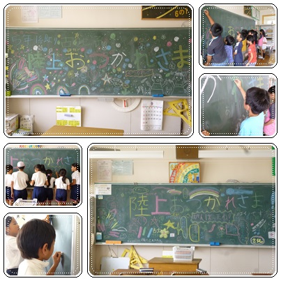 今日は、朝から6年生が陸上運動記録会へ出かけていきました。学校で、6年生が自己ベストが出るのを願っていました。そして、暑い中頑張ってきた6年生を温かく迎えるために、黒板に一生懸命メッセージを書きました。