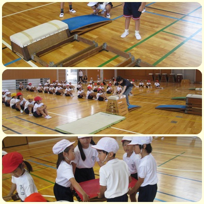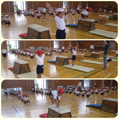3時間目に学年体育を行いました。今日から「跳び箱を使った運動遊び」が始まり体育館に集まりました。準備運動の後、跳び箱の準備の仕方を聞きました。マット・跳び箱4段・ロイター板をグループで協力して運びました。大きくて重い道具を安全に運び、順番に跳び始めました。跳び箱の上に一度跳び乗り、そこからマットの上に着地した後のポーズが決まっていますね。