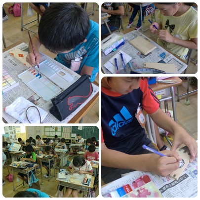 図工の授業では、「板から何が」の学習に入りました。世界に一つだけのオルゴールを作ります。2組では板に彫刻刀で自分たちの思い思いの模様を描き、彫刻刀で彫っていきます。その後は、きれいに着色をしていきました。子どもの作品を見ていると、学級目標や学年目標、今までのクラスを彫っている子が多くいました。小学校生活の思い出の作品になるといいですね。