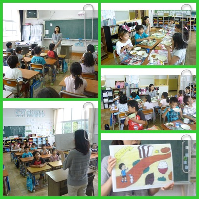 今日は、給食の時間にいつも給食を作っていただいている栄養教諭の先生と一緒に給食を食べました。食べながら、誕生日の話をして、楽しく過ごしました。いつもはあまり食べない子も,栄養教諭の先生と食べたら、残さずによく食べていました。食べた後に、栄養の紙芝居を読んでもらいました。