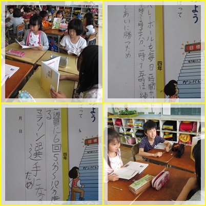 道徳の時間に、マラソン選手の高橋尚子選手の話から、一人一人目標をたてました。目標は、夢をかなえるために今すぐ取り組めるものです。例えば、「家に帰ってから、30分自主勉強をする」「毎日サッカーのリフティングを100回行う」などです。