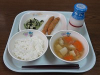 今日の献立は「ご飯、湯葉のすまし汁、豚肉のショウガ焼き、小松菜のお浸し、牛乳」(559kcal)です。