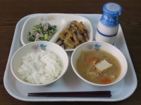 今日の献立は「ご飯、味噌おでん、サバの塩焼き、小松菜のゴマ和え、牛乳(ココア牛乳の素)」(671kcal)です。