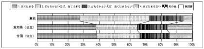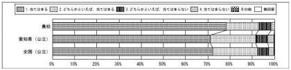 全国・愛知の平均値と比較して「どちらかと言えば好き」が多い傾向にあります。分かる喜びを味わわせつつ、「どちらかと言えば」から「当てはまる」となり、大切と思う姿勢をさらに伸ばしていければ、と考えます。
