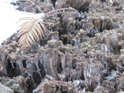 氷点下になる時に、地中の水分が毛細管現象(毛管現象)によって地表にしみ出して柱状に凍結したもの。