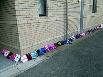 海の活動後のマリンシューズが、外にきれいに並べて乾かしてありました。