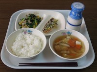 今日の献立は、「秋の味覚たっぷりカレー(麦ご飯)、焼きフランクフルト、福神キャベツの即席和え、牛乳」(703kcal)です。