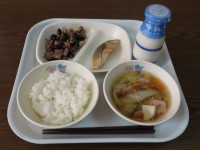 今日の献立は「ご飯、肉根じゃが、和風ハンバーグ、キャベツの塩昆布和え、牛乳」(681kcal)です。