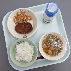 今日の献立は、「ご飯、アーサー汁、タマナーチャンプル、紅芋コロッケ、牛乳」(596kcal)です。