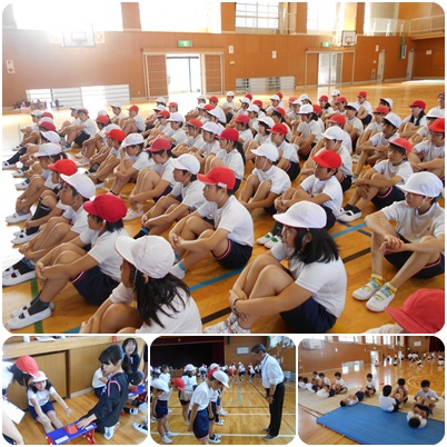 体育館の競技と運動場の競技が3つずつあり、水筒を持って参加しました。