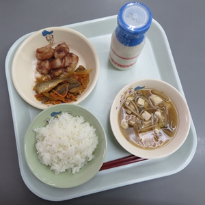 今日の献立は「ご飯、けんちん汁、へらへら団子、野菜たっぷりアジの南蛮漬け、牛乳」(601kcal)です。