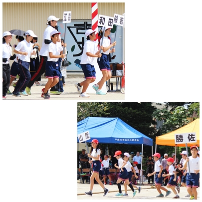 通学班対抗のつな引きが始まる。 どの通学班も、にこやかに入場。