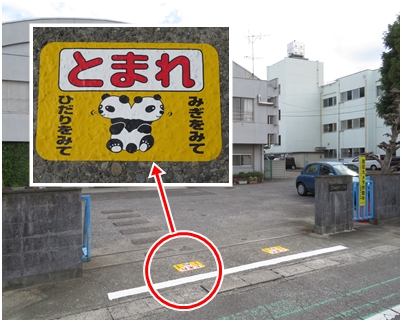 公民館門の出入り口に白線と共に、かわいいパンダの絵をあしらった「ストップマーク」がつきました。