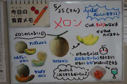 ※今日のメロンは、「ハネデュー」という品種です。ハネデューとは「はちみつのしずく」という意味で、果汁が多く甘みがあるので食べやすいメロンです。