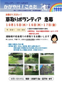 草取りボランティア活動のご協力をお願いいたします。10月15日(水)・16日(木)・17日(金)の9:00~10:00まで行います。運動会を10月25日に予定しております。子ども達の思い出に残る運動会...