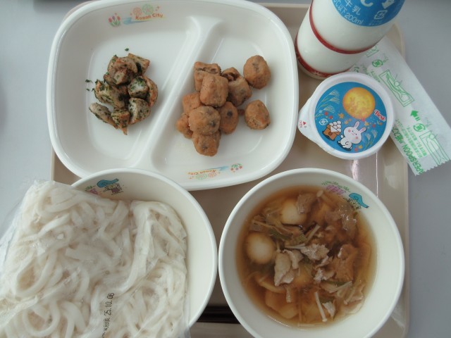 今日の献立は、しらたまうどん・牛乳・つきみうどん・れんこんだんごのあまからに・さといもののりまぶし・じゅうごやゼリーです。