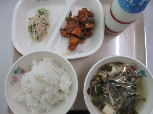 今日の献立は、ごはん・牛乳・あきやさいのすぶた・バンバンジー・はるさめスープです。