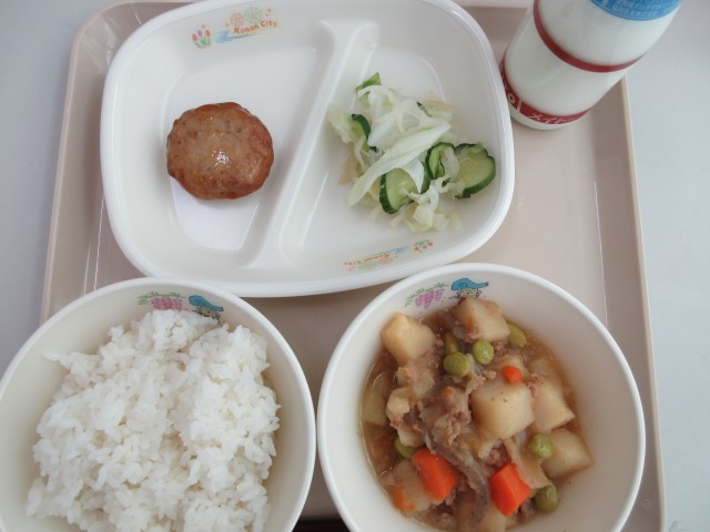 今日の献立は、ごはん・牛乳・やさいつくね・じゃがいものそぼろに・たくあんあえです。