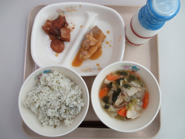 今日は食育の日の献立です。蒲郡市は県内一のみかん産地です。温暖な気候や水はけのよい土壌がみかん栽培に適しています。今日は蒲郡みかんを鶏肉に甘酸っぱいソースとして使ってありましたね。