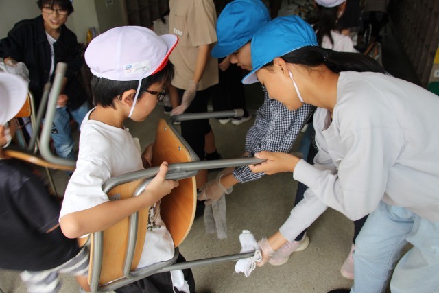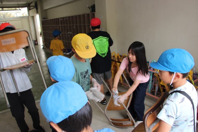 6年生を中心とする「美化委員」が1年生の椅子から順番に足拭きをしてくれていました。