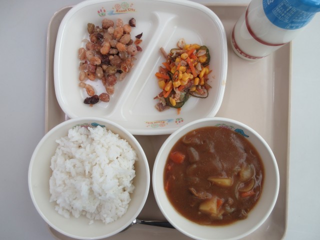 今日の献立は、ごはん・牛乳・きゅうしょくばんちょうカレーライス・りっちゃんのげんきサラダ・ひゃくみビーンズあげです。