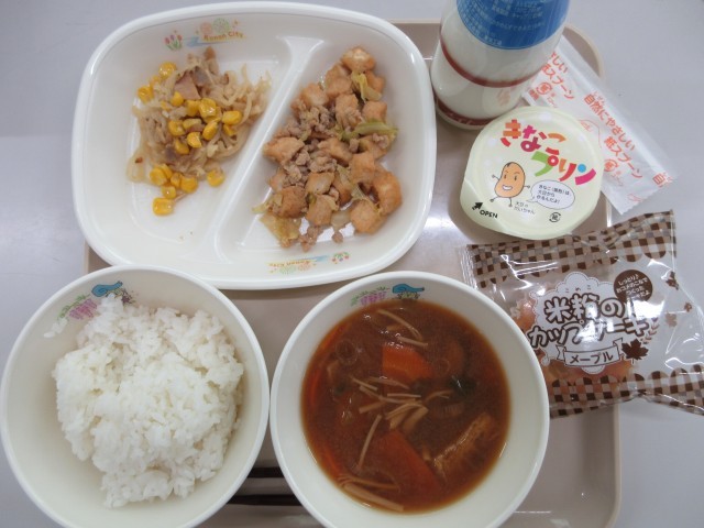 今日の献立は、ごはん・牛乳・あつあげのピリからそぼろ・きりぼしだいこんとベーコンいために・きのこのぐだくさんみそしる・セレクト給食:きなこプリン/メープルマフィンです。