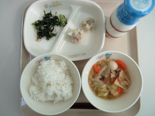 今日の献立は、ごはん・牛乳・あいちのれんこんしゅうまい・ちゅうかに・わかめサラダです。