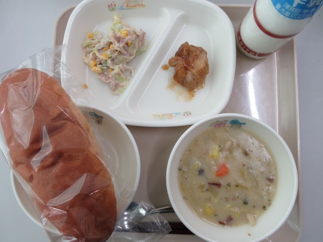 今日の献立は、あいちのこめこパン・牛乳・とりにくのソテーいちじくソースがけ・さつまいもときのこのシチュー・キャベツのツナサラダです。