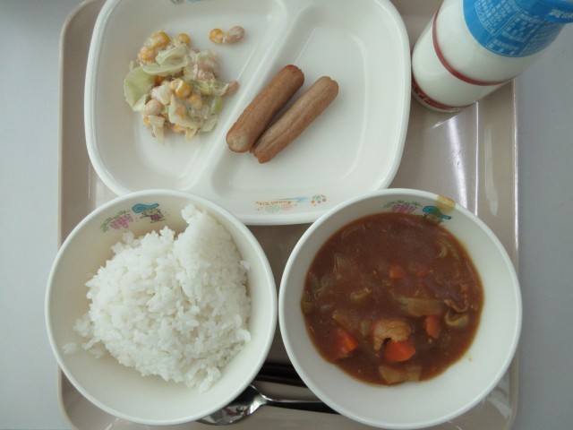 今日の献立は、ごはん・牛乳・ポークカレー・ウインナー・だいずサラダです。
