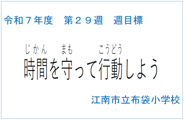 今週の週目標は「時間を守って行動しよう」です。チャイム前には着席をする。体育の時には素早く着替えて移動するなど、早めに行動をして授業に間に合うようにしましょう。