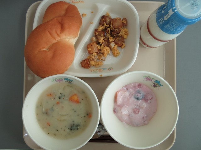 今日の献立は、クロスロールパン・牛乳・ミートボールのクリームに・ピッティパンナ(スウェーデンふうベーコンポテト)・ベリーヨーグルトです。