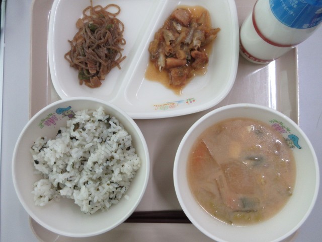 今日の献立は、わかめごはん・牛乳・わかさぎとれんこんのこしづねぎだれがけ・こんにゃくのきんぴら・ふゆやさいのとうにゅうじるです。