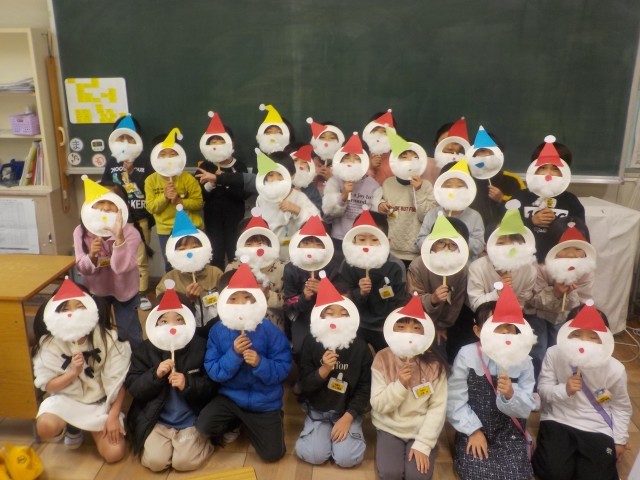 一足早く、サンタクロースになった1年生。メリークリスマスと笑顔で写真を撮りました。はさみやのり、ボンドを正しく使いながら、制作手順をよく聴いてサンタさんを作ることができました。出来上がったときに友達と見合って、笑顔になっていました。ぜひ、お家でも飾ってクリスマス気分を味わってください。