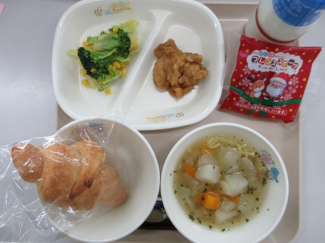 本日終業式の献立は、クロワッサン・牛乳・とりにくのレモンソース・ブロッコリーサラダ・ABCスープ・カップケーキです。