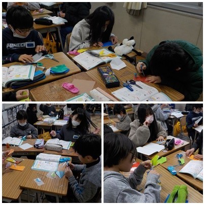 算数の「円と正多角形」の学習では、折り紙を使って多角形を作り、正六角形と正八角形の特徴を「長さ」や「角度」の視点で調べました。今後は、「長さ」や「角度」をもとに正多角形を描く学習をしていきます。