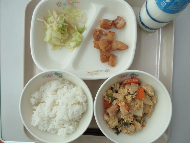 今日の献立は、ごはん・牛乳・たらのコロコロあげ・こうやどうふのたまごとじ・あまずあえです。