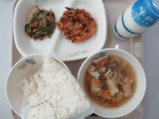 今日の献立は、きしめん・牛乳・ごもくきしめん・あいちのやさいかきあげ・こまつなとしらすのいためものです。