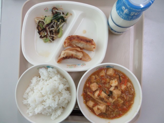 今日の献立は、ごはん・牛乳・むしぎょうざ・マーボーどうふ・ちゅうかサラダです。