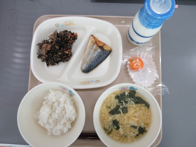 今日の献立は、ごはん・牛乳・さばのしおやき・ひじきのいために・かきたまじる・きんかんです。