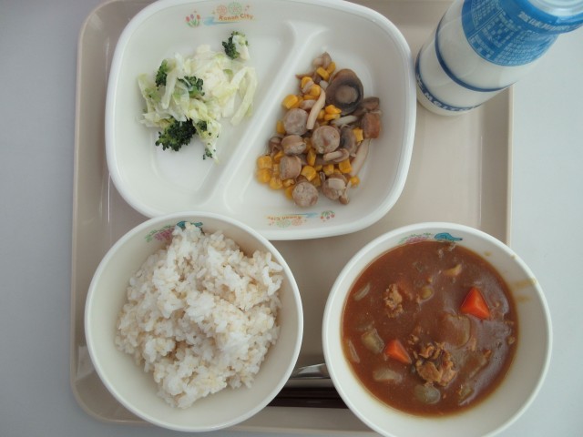 今日の献立は、げんまいごはん・牛乳・ふゆやさいカレー・ウインナーときのこのバターソテー・はなやさいサラダです。