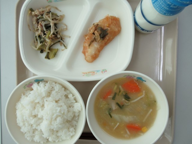 今日の献立は、ごはん・牛乳・かれいのこうみだれ・あおないため・ちゅうかふうコーンスープです。