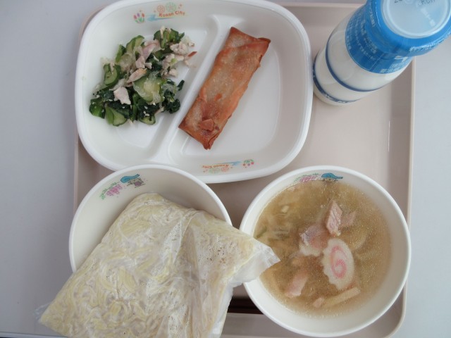 今日の献立は、ちゅうかめん・牛乳・しおラーメン・はるまき・かんてんいりちゅうかあえです。