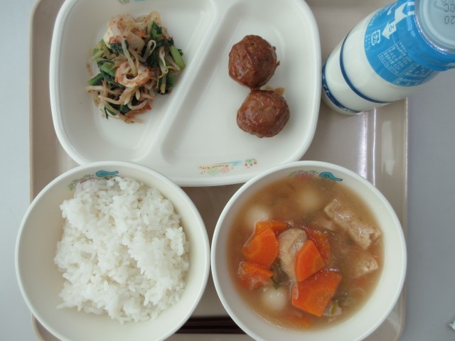 今日の献立は、ごはん・牛乳・ごぼういりつくね・おかかあえ・もちいりみぞれじるです。